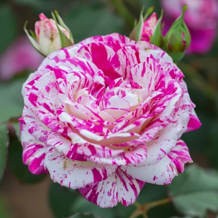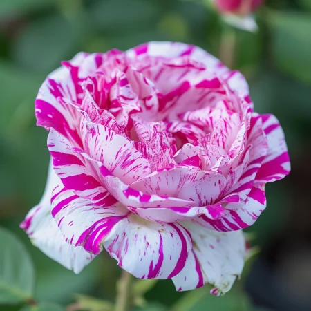 Okrasna sorta z izjemno privlačnimi dvobarvnimi cvetovi — belimi lističi s rdečimi ali roza žilami. Cvetovi so srednje veliki do veliki, pogosto polpolni, z prijetnim vonjem. Rastlina je kompaktna, s temno zelenimi, sijočimi listi, primerna za vrtove, gredice in vaze. Sorta je znana po odpornosti in dolgem obdobju cvetenja.